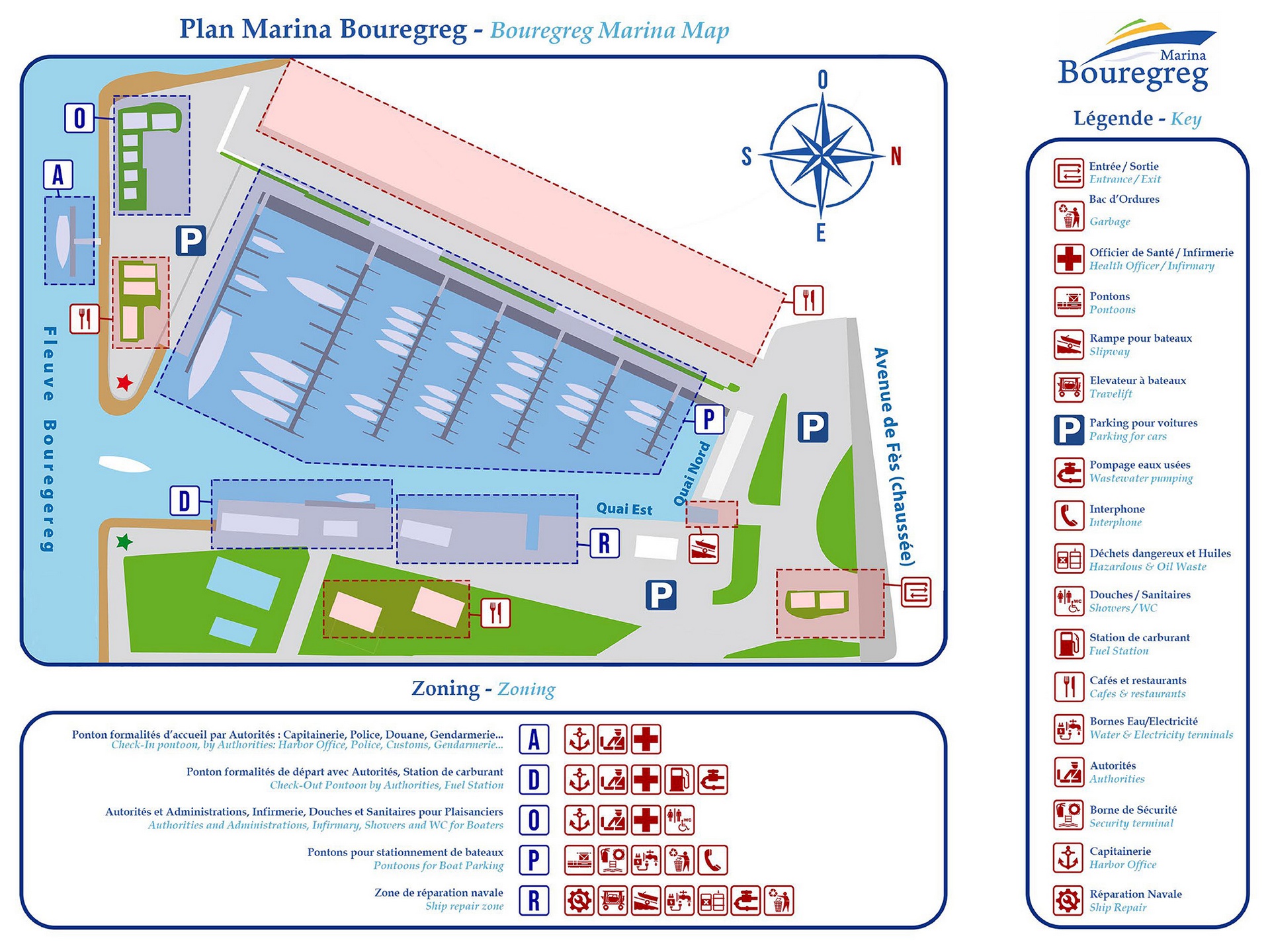 La Bouregreg Marina est nichée à l'embouchure du fleuve Bouregreg, entre la capitale et la ville de Salé. Ce port, implanté dans un site emblématique, est spécialement conçu pour accueillir les bateaux de plaisance d'une longueur maximale de 40 mètres et d'un tirant d'eau ne dépassant pas 4 mètres. Il est aménagé pour répondre aux besoins spécifiques des bateaux suivants :