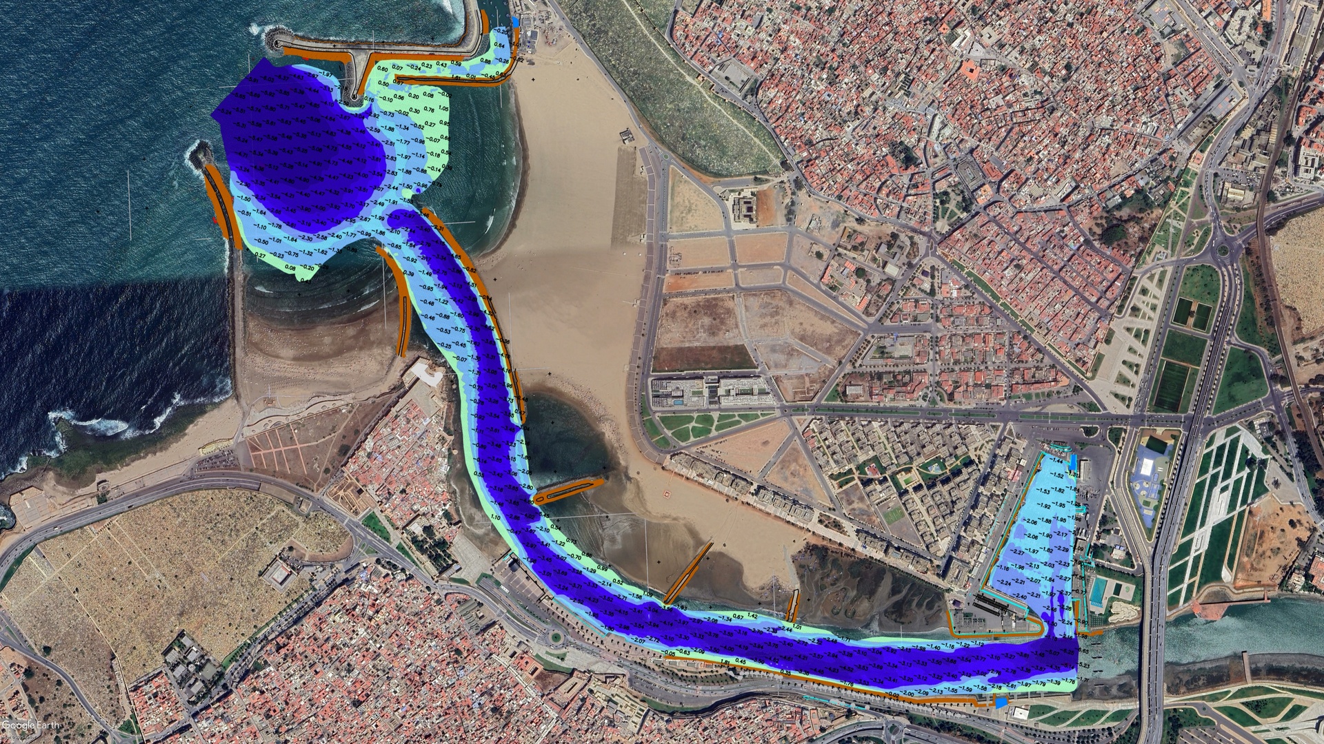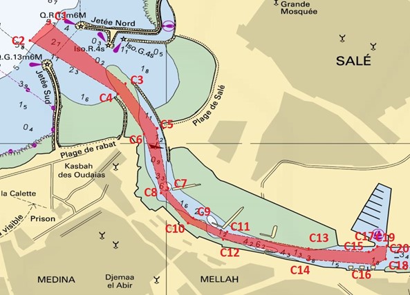 L’accès au port de Bouregreg est orienté à l’entrée avec un cap de 130° jusqu’au franchissement des diguettes pour changer vers 150°. Le deuxième changement s’effectue au milieu du passage entre les diguettes sur un cap de 167°, le troisième changement s’effectue au travers de l’épi de calibrage de Salé sur le cap de 143°, puis sur 116° au milieu de la route vers le travers de l’épi embarcadère, sur ce dernier un changement vers le cap de 104°, le dernier changement avant l’entrée à la marina est effectué au travers de l’avenue Al Alaouiyine sur le cap de 90°. La sortie de la marina s’effectue avec la reprise inverse du parcours suivi pour entrer au port. Le chenal d’accès est à double sens de navigation, toutefois seul l’entrée ou la sortie est autorisée à la fois. les navires peuvent faire appel aux services de la capitainerie pour les guider à l'entrée et à la sortie du port